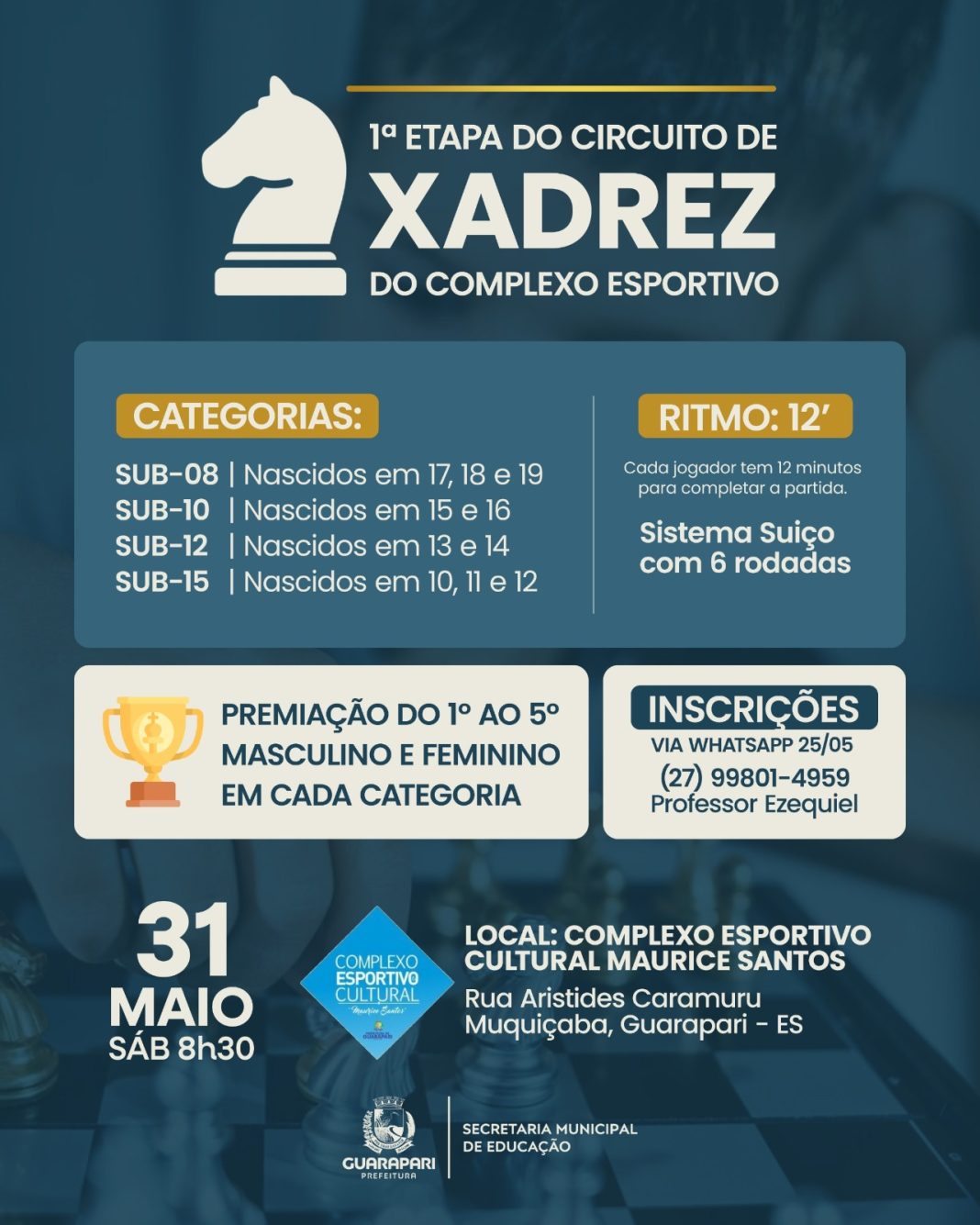 A cidade se prepara para receber a 1ª Etapa do Circuito de Xadrez, que acontecerá no próximo dia 31 de maio (sábado), a partir das 8h30, no Complexo Esportivo Cultural Maurice Santos. O Circuito é uma realização da Prefeitura de Guarapari, por meio da Secretaria Municipal de Educação, com objetivo de incentivar o esporte e a cultura entre os jovens.