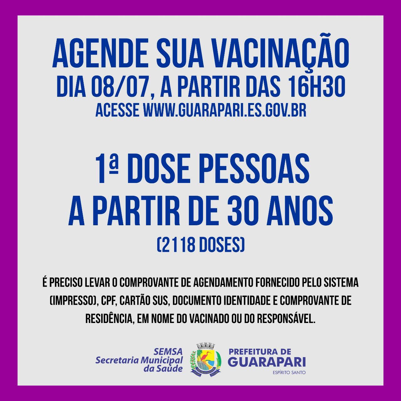 A Prefeitura de Guarapari anunciou a abertura de mais de 2 mil vagas de agendamento de vacina contra a Covid-19 para pessoas com mais de 30 anos.