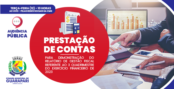 A Câmara Municipal de Guarapari convoca para uma Audiência Pública, onde serão apresentadas as contas da Prefeitura referentes ao 3º Quadrimestre de 2023. Este importante encontro contará com a participação dos parlamentares da Comissão de Economia e Finanças, assim como os técnicos do setor orçamentário e contábil da Secretaria Municipal de Fazenda, juntamente com os demais vereadores.