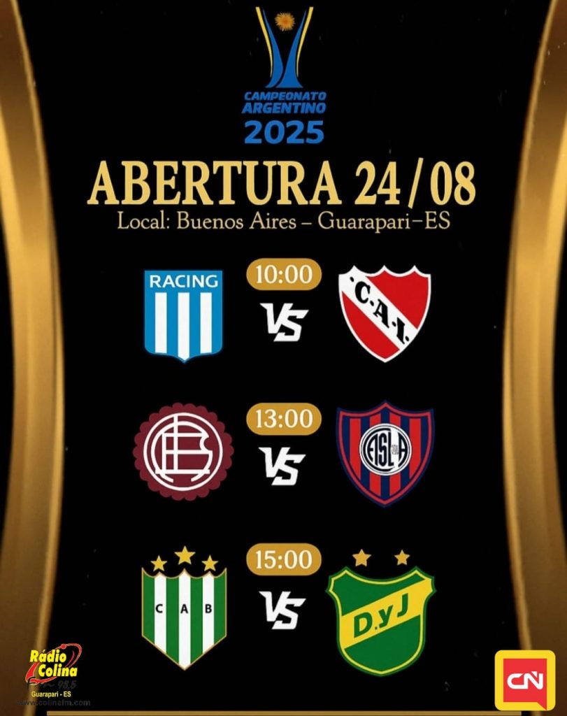 Início Destaques Amanhã (24) começa o Campeonato Argentino de Futebol, que acontece no distrito... DestaquesEntretenimentoEsporteGuarapariNoticia rapidasNoticias Amanhã (24) começa o Campeonato Argentino de Futebol, que acontece no distrito de Buenos Aires, em Guarapari, Espírito Santo Por Redação Colina Noticias - 23/08/2025 51 0 Compartilhado FacebookTwitterWhatsAppLinkedinTelegram terá início amanhã, dia 24 de agosto de 2025. As últimas edições registradas aconteceram entre agosto e dezembro. ARTIGOS RELACIONADOSMais do autor PALAVRAS DE BENÇÃOS COM PADRE GUDIALACE 1938 Rayan brilha, Vasco vence Fortaleza com um a menos em boa parte do jogo e vai à primeira metade da tabela do Brasileirão Flamengo atropela Botafogo em clássico quente e segue caça ao Palmeiras pela liderança do Brasileirão