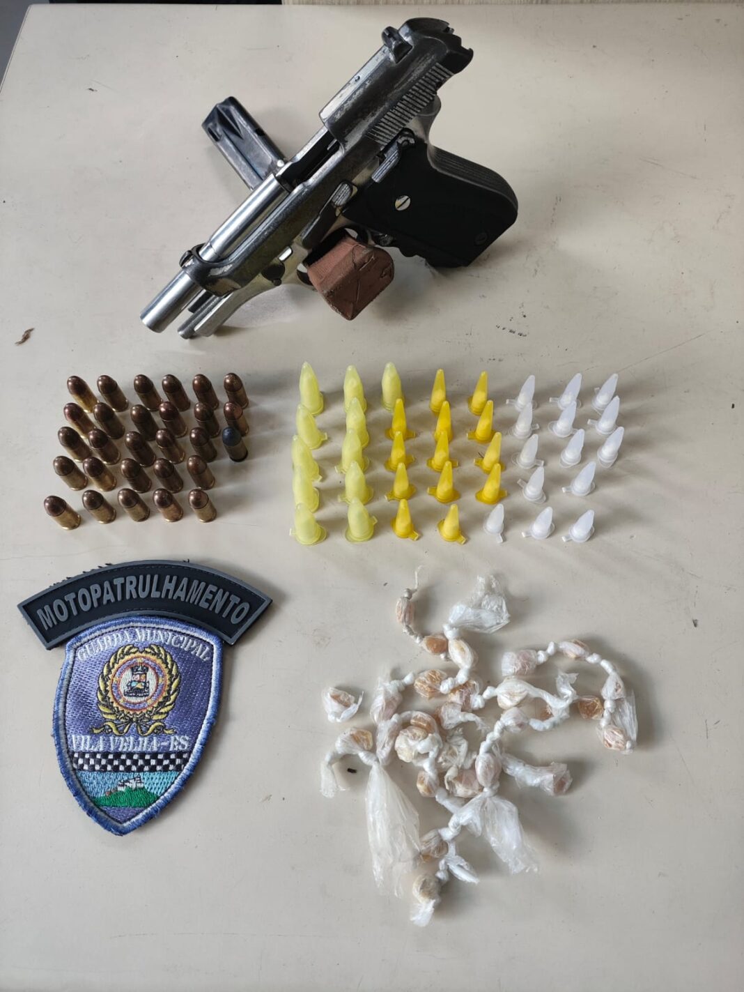 Durante a abordagem os agentes encontraram uma arma, um carregador alongado, 28 munições cal.380, 38 pinos de cocaína e 27 pedras de crack.