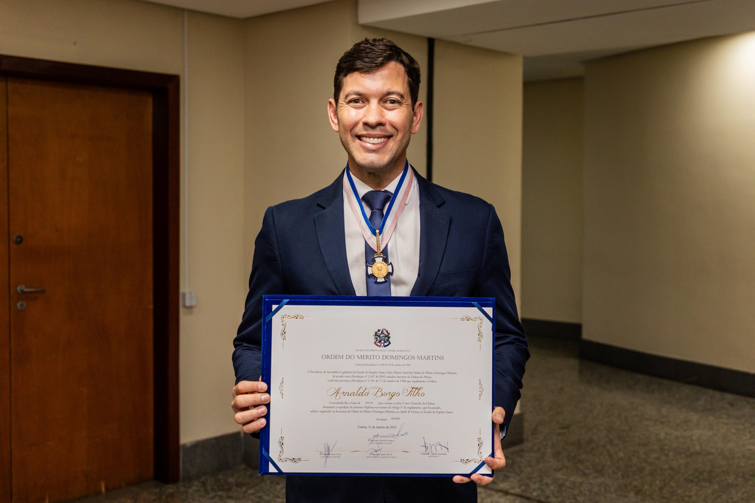 O prefeito de Vila Velha, Arnaldinho Borgo, foi homenageado na noite de quarta-feira (9) com a Ordem do Mérito Domingos Martins, a mais alta condecoração concedida pela Assembleia Legislativa do Espírito Santo (Ales). A honraria reconhece personalidades e instituições que prestam serviços de grande relevância à população capixaba.