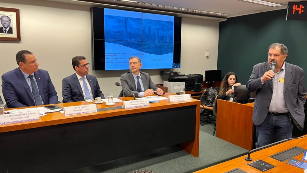 Na Câmara dos Deputados, Marcelo Santos participou de Audiência Pública do Grupo de Estudos e Debates Estratégicos para avaliar os recentes aumentos nas taxas de juros e seus impactos sobre a dívida pública brasileira.