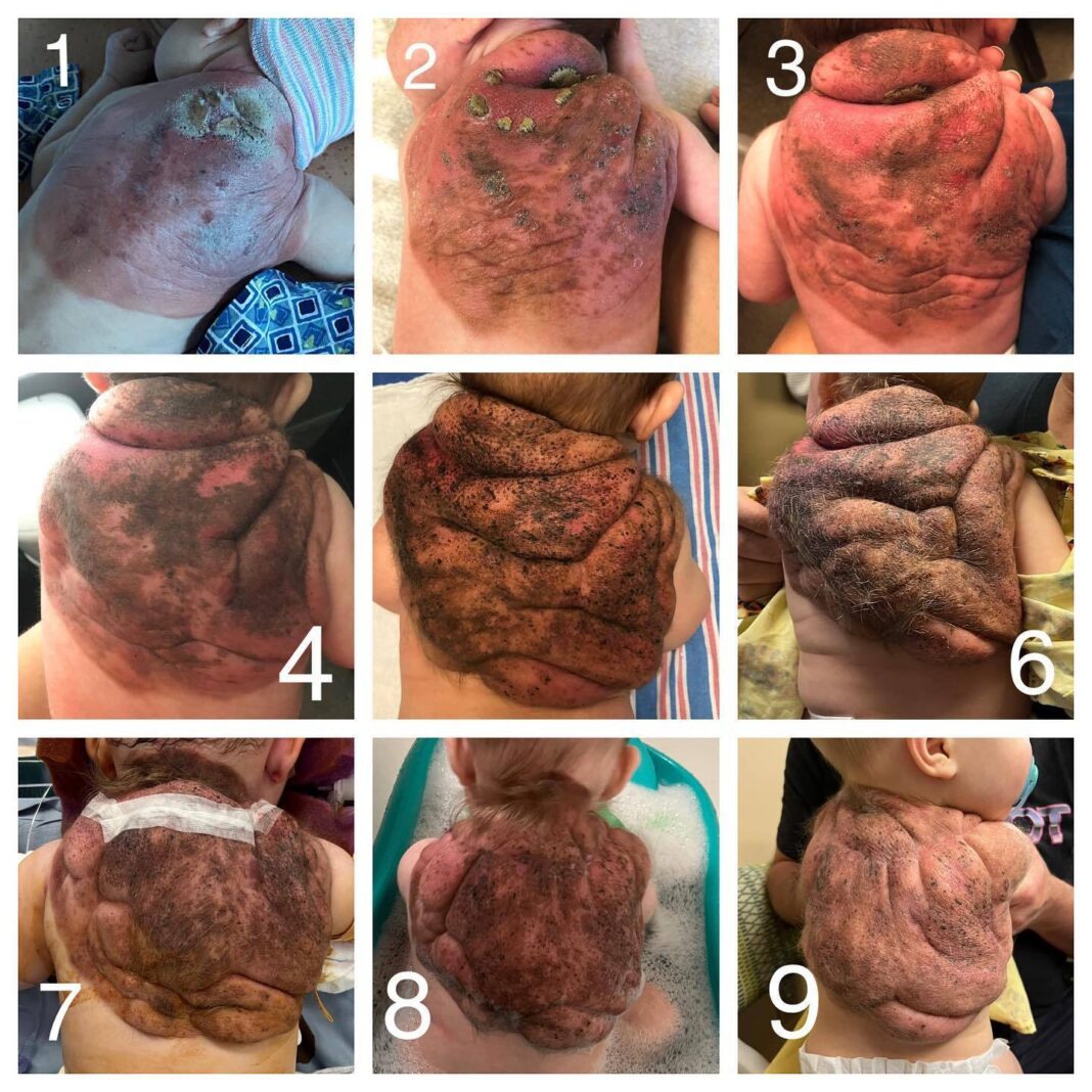 Ela relatou, ainda, que houve um crescimento rápido da lesão, que chegou a cobrir cerca de 75% das costas da criança. Entretanto, a realização de ressonâncias magnéticas atestou não haver crescimento de massa em seu interior.