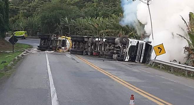 De acordo com a concessionária que administra a via, o acidente envolveu uma carreta, que transportava peróxido de hidrogênio e dois caminhões