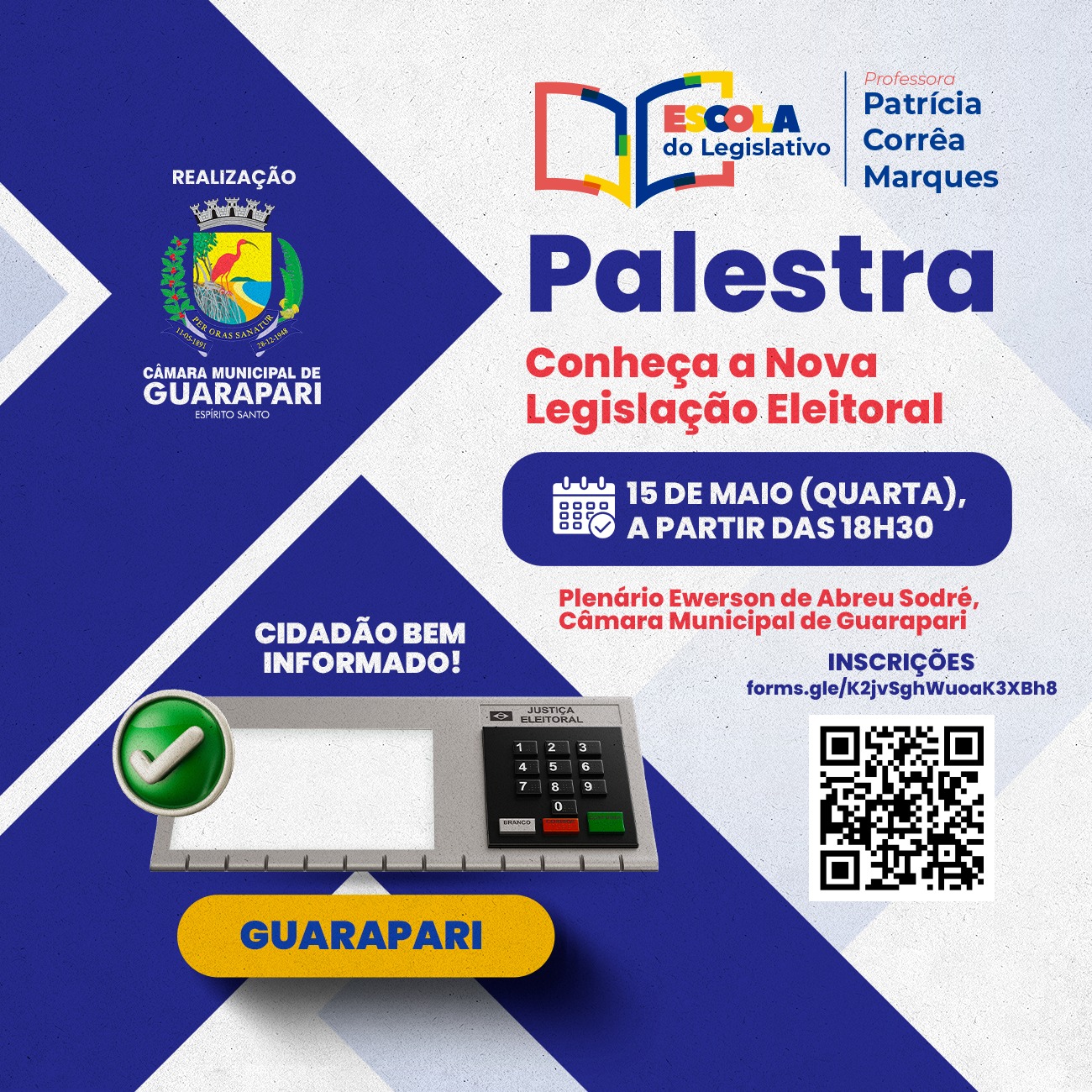 A Câmara Municipal de Guarapari, por meio da Escola do Legislativo “Professora Patrícia Corrêa Marques”, convida todos os Cidadãos Guaraparienses para um evento gratuito sobre as últimas alterações na legislação eleitoral para o ano de 2024. A palestra será ministrada pelo Dr. Renan Nossa Gobbi, Procurador-Geral da Câmara Municipal de Guarapari, especialista em Direito Eleitoral e Professor Universitário.