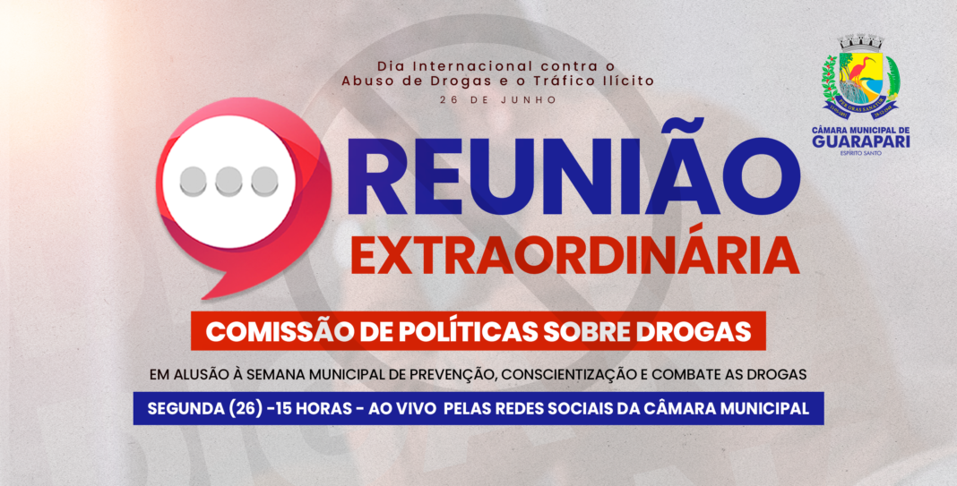 A Câmara Municipal de Guarapari realizará, na próxima segunda-feira às 15 horas, uma reunião extraordinária da Comissão Permanente de Políticas sobre Drogas em alusão à semana municipal de prevenção, conscientização e combate as drogas. O evento foi idealizado pelas vereadoras Sabrina Astori e Rosana Pinheiro, que são presidente e relatora da comissão, e pelo vereador Marcelo Rosa, que é membro.