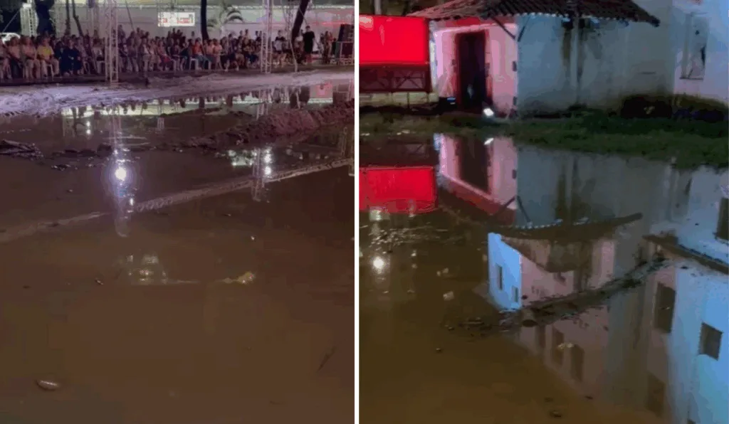 Em uma publicação nas redes sociais, divulgada pela Prefeitura de Guarapari, é possível perceber que o local onde aconteceria o espetáculo ficou completamente alagado.