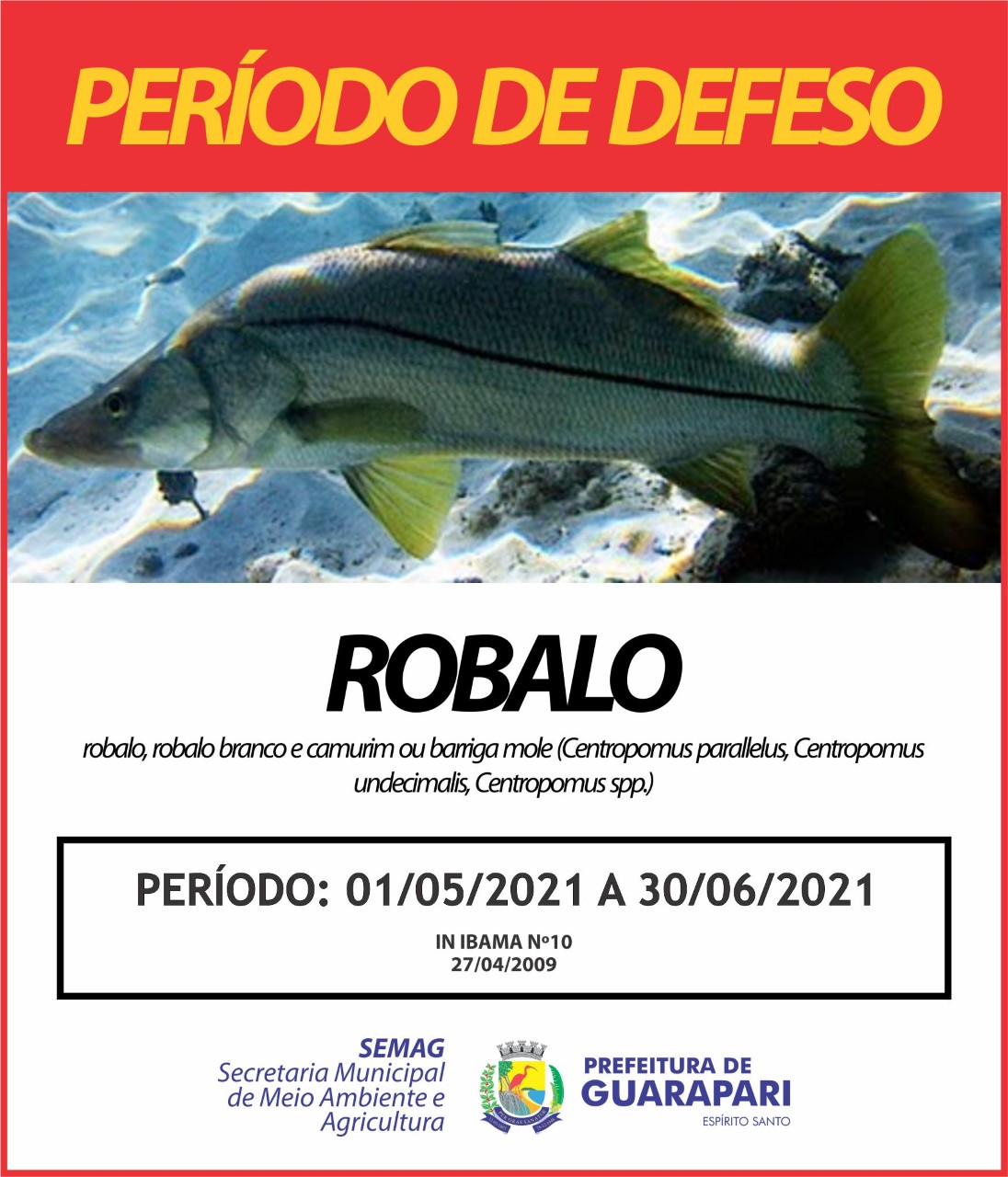 A partir deste sábado, dia 1º de maio, começa o período de defeso do robalo, robalo branco e camurim (barriga mole), em todo o Espírito Santo. O defeso é instituído através da Instrução Normativa Ibama Nº 10, de 27 de abril de 2009, do Instituto Brasileiro do Meio Ambiente e dos Recursos Naturais Renováveis (Ibama).