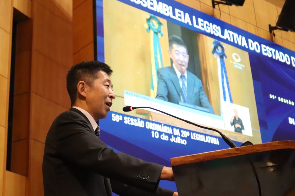 Por sua vez, o Cônsul Geral do Japão, Ken Hashiba, expressou sua honra e emoção em visitar a Assembleia Legislativa do Espírito Santo, agradecendo a receptividade do presidente Marcelo Santos e de sua equipe. “Esse anos comemoramos o 115º aniversário do início da imigração japonesa no Brasil e eu, enquanto diplomata, tenho a missão é estreitar e aprimorar ainda mais as relações entre os dois países”. O Cônsul, afirmou estar honrado e emocionado em estar na Ales e agradeceu a receptividade do presidente Marcelo Santos pelo acolhimento que recebeu junto com sua equipe.