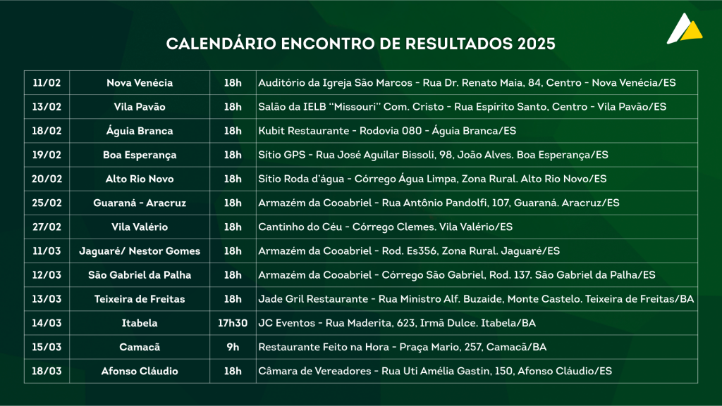 A agenda antecipará os números e realizações referentes a 2024, que serão compartilhadas na Assembleia Geral Ordinária- AGO 2025, com data para a segunda quinzena de março, em São Gabriel da Palha/ES. Ainda na pauta, serão abordados assuntos relacionados à próxima safra de conilon e considerações sobre o mercado de café.