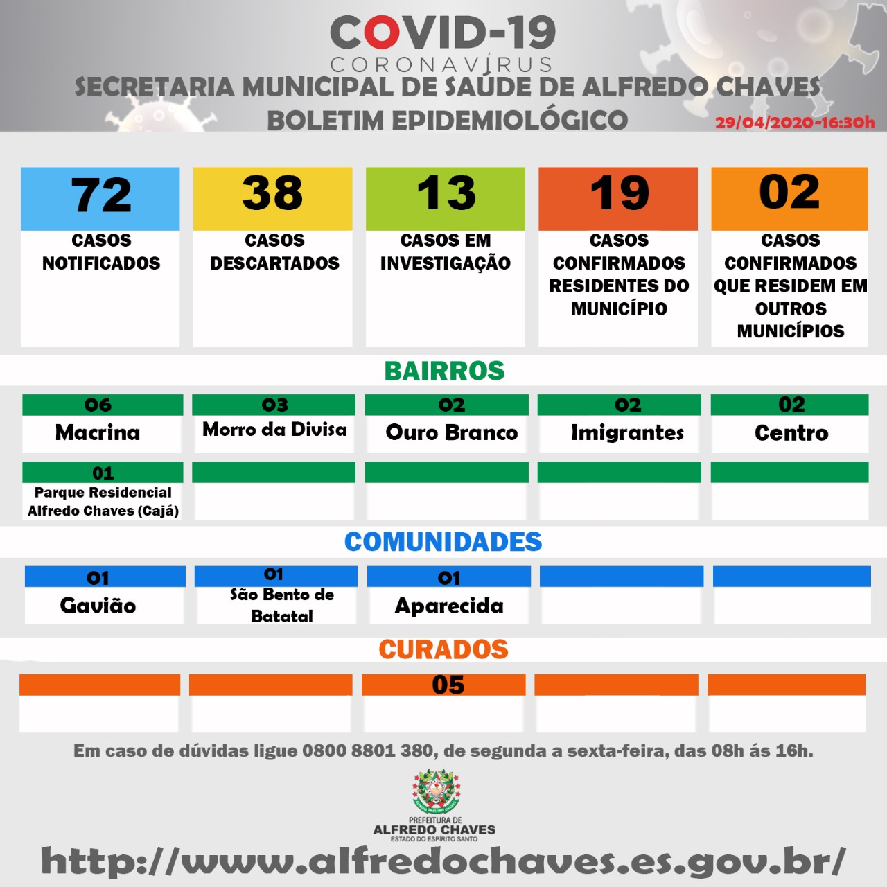 Início Alfredo Chaves COVID-19 28/04/2020 Alfredo ChavesDestaquesSaúdeSem categoria COVID-19 28/04/2020 Por Redação Colina Notícias - 29/04/2020 69 0 Compartilhado FacebookTwitterWhatsAppLinkedinTelegram BOLETIM EPIDEMIOLÓGICO DE ALFREDO CHAVES – ES WWW.COLINANOTICIAS.COM.BR ARTIGOS RELACIONADOSMais do autor Morre idosa que teve rosto desfigurado após crime em Guarapari Ofertas de Primavera Grande Rio Lixo na Praia do Morro em Guarapari mancha um final de tarde que poderia ser só beleza