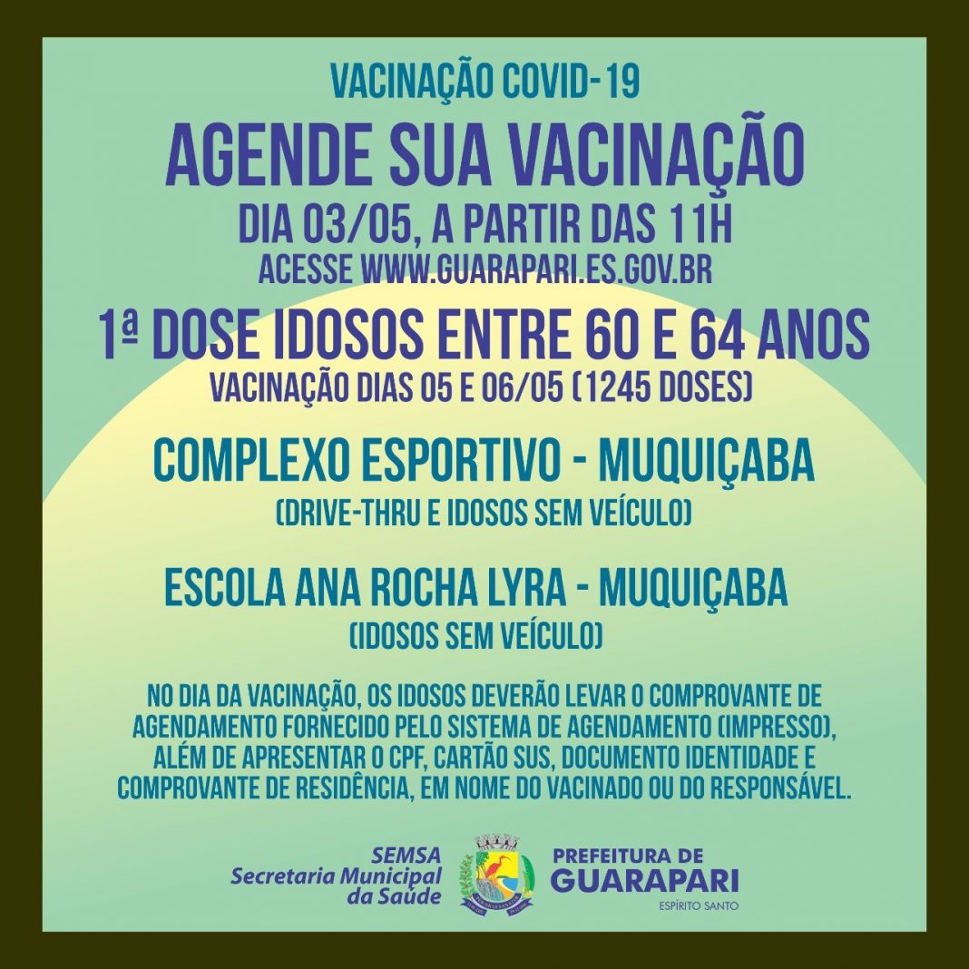 A Prefeitura de Guarapari, por meio da Secretaria Municipal de Saúde (Semsa), abre nesta segunda-feira (03), a partir das 11h, o novo agendamento da vacinação contra o Covid-19, para os idosos de 60 a 64 anos.