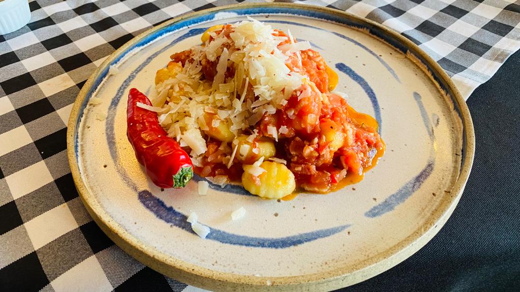 Frite o bacon no azeite até dourar levemente. Junte a cebola, o alho e a dedo de moça. Refogue um pouco e acrescente os tomates e cozinhe até encorpar. Se necessário, pingue água. Corrija o sal e acrescente pimenta preta. Junte a pasta e sirva com o pecorino.