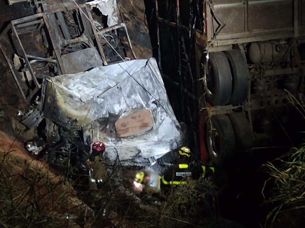 Com o impacto, o cavalinho da carreta pegou fogo. As equipes do Corpo de Bombeiros conseguiram apagar o incêndio. Os socorristas localizaram a primeira vítima já sem vida presa na cabine, mas não conseguiram retirar o corpo por estar parcialmente soterrado.