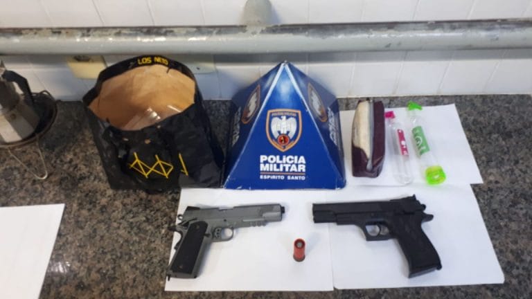 Dupla é detida com munição e armas falsas em Guarapari Policiais militares realizavam patrulhamento preventivo no bairro Ipiranga, nesta terça-feira, 11, quando avistaram dois indivíduos em atitude suspeita. Durante a abordagem foi encontrado uma sacola contendo materiais para embalo de entorpecentes. Dentro da residência da dupla, a PM apreendeu 01 munição calibre 12, 02 réplicas de pistola e 02 frascos de lança perfume vazios.