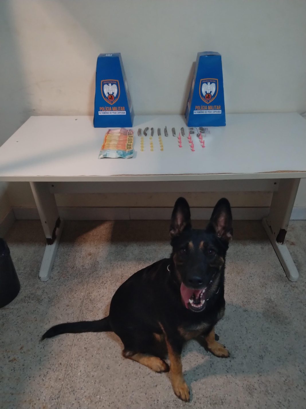 Na segunda-feira (28), no bairro Nossa Senhora da Conceição, após informação do serviço de inteligência, os militares realizaram buscas com apoio da equipe K9. O cão de faro Lobo localizou 30 pinos de cocaína, 1 tira de maconha, 18 buchas de maconha e 26 pedras de crack que haviam sido abandonadas por suspeitos que fugiram do local ao avistar a equipe policial.