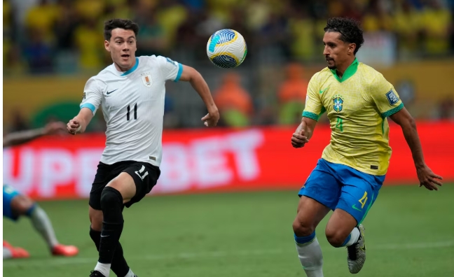 Aos 9, Valverde levou a melhor sobre Bruno Guimarães e finalizou no cantinho para fazer 1 a 0 para o Uruguai.