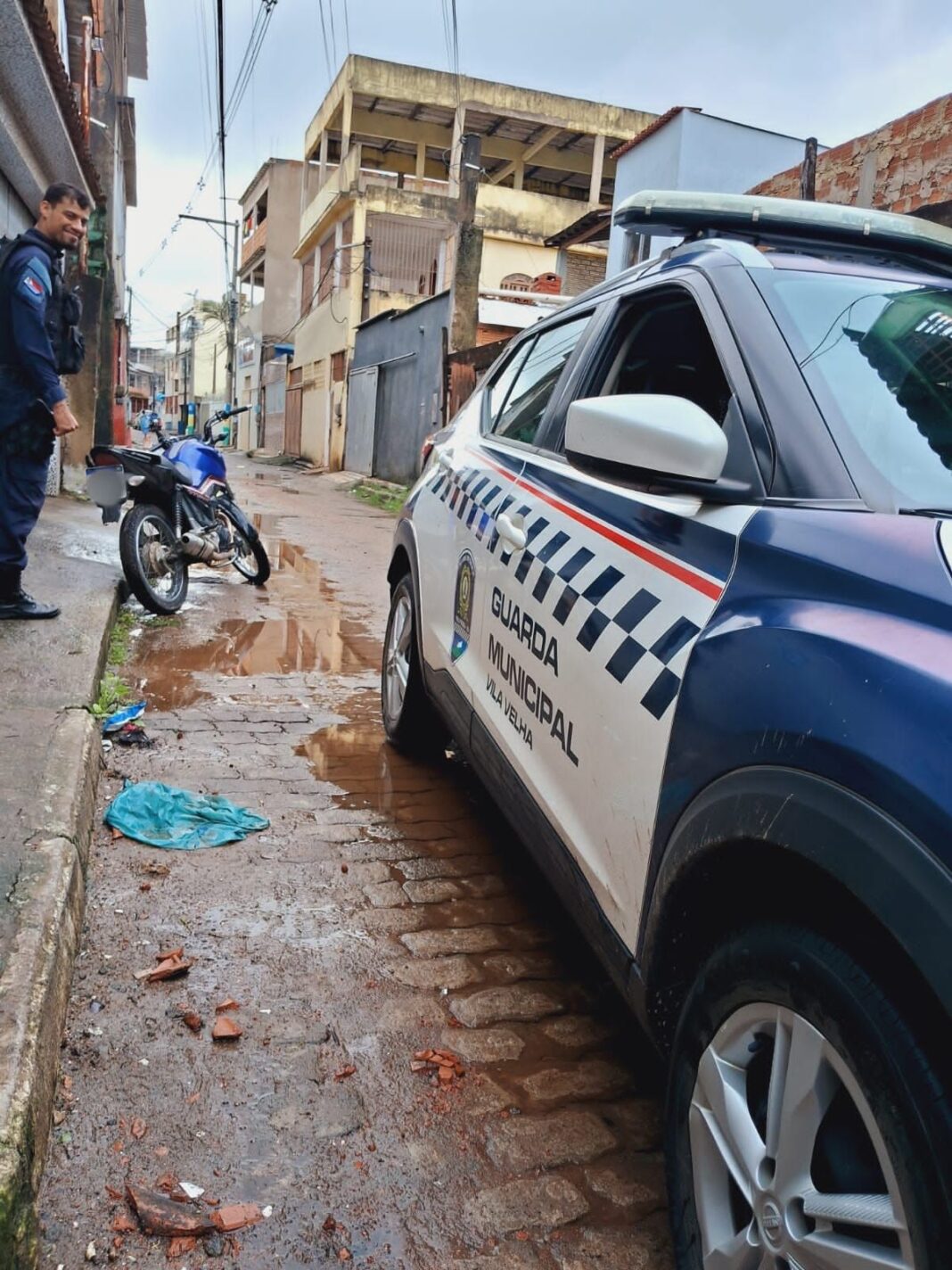 Durante a vistoria, constataram que o chassis da moto estava adulterado. A equipe chamou o guincho para removê-la. Durante a espera, uma outra equipe da GMVV avistou algumas peças de automóveis dentro do terreno da casa abandonada.