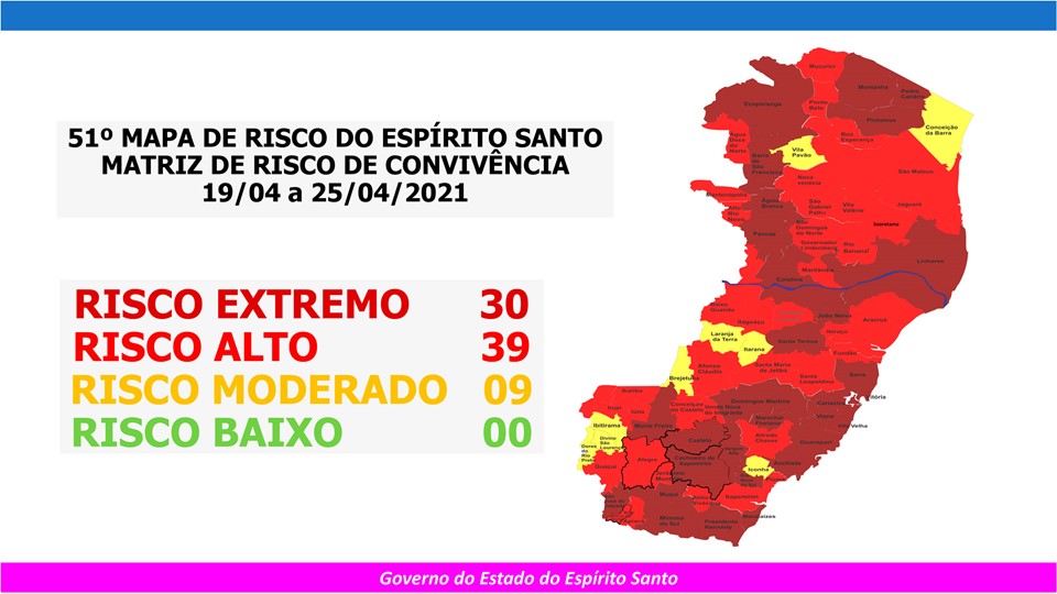 O Governo do Estado anunciou, nesta sexta-feira (16), o 51º Mapa de Risco Covid-19, que terá vigência desta segunda-feira (19) até o próximo domingo (25). Dos 78 municípios capixabas, 30 estão classificados em Risco Extremo, 39 em Risco Alto e outros nove em Risco Moderado. Não há municípios classificados em Risco Baixo.