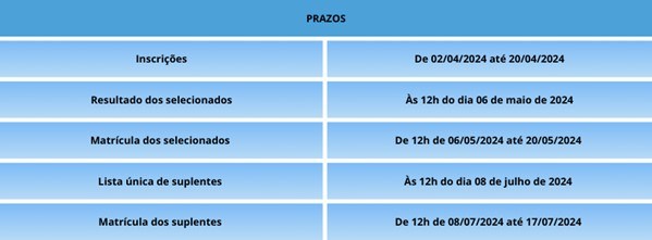A lista com os nomes dos selecionados no programa será divulgada no dia 06 de maio de 2024, às 12h, no site do Detran|ES. Neste ano, além de 5% das vagas reservadas para Pessoa com Deficiência (PCD), também serão destinadas 8% das vagas para os egressos do sistema prisional a partir de Cooperação Técnica firmada entre o Detran|ES e a Secretaria da Justiça (Sejus). Caso essas vagas reservadas não sejam preenchidas, o quantitativo vago será revertido para ampla concorrência.