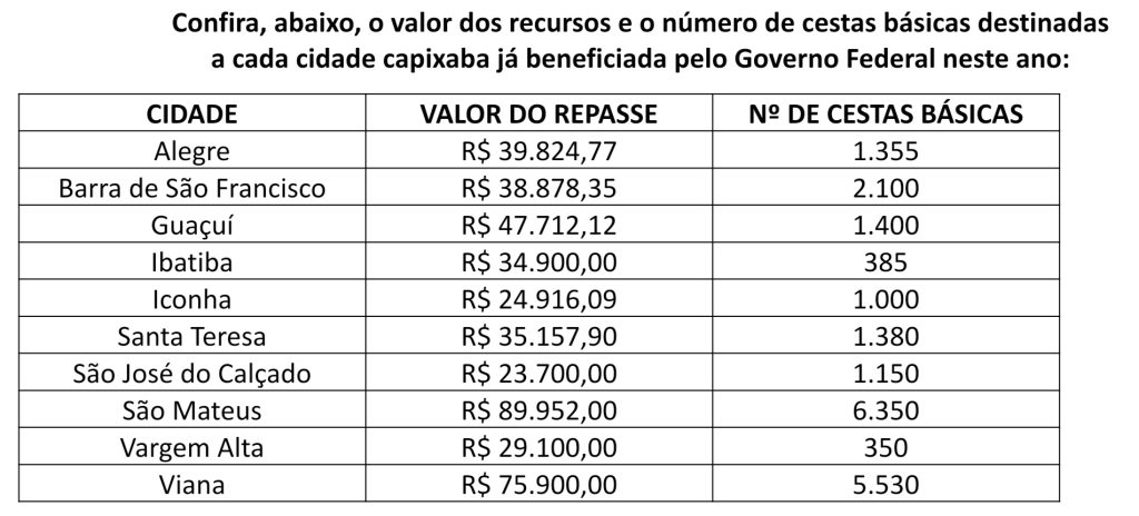 Ao todo, 10 primeiros municípios capixabas já receberam do Governo Federal 20 mil cestas básicas e o repasse de R$ 440 mil, sob a supervisão da Polícia federal e o acompanhamento do deputado Evair de Melo. Segundo Evair, em breve, Afonso Claudio, Mimoso do Sul, São Gabriel da Palha, Bom Jesus do Norte e Mucurici também serão beneficiados com recursos financeiros e a distribuição de alimentos para as famílias mais necessitadas.