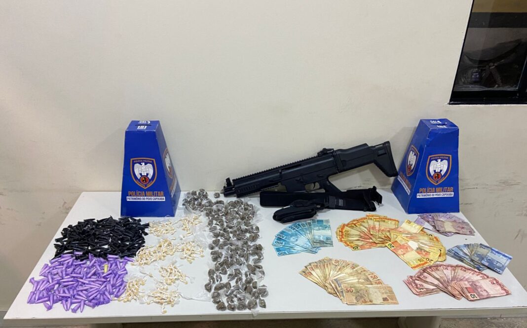 crack, 153 buchas de maconha, R$ 5.384,00 em espécie, um simulacro de arma de fogo e um coldre e