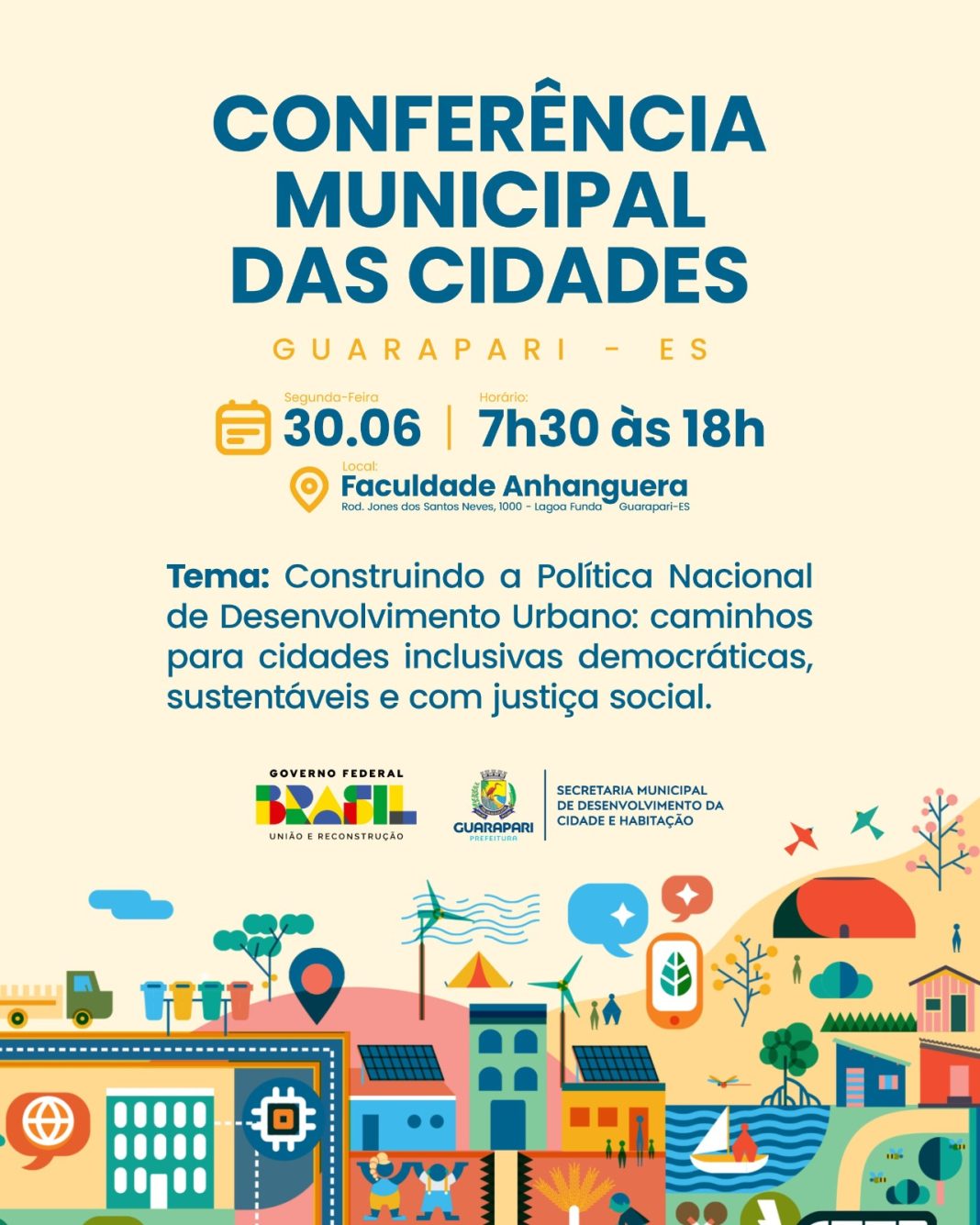 A Prefeitura de Guarapari, por meio da Secretaria Municipal de Desenvolvimento da Cidade e Habitação (SEMDEH) e do Conselho Municipal das Cidades, realiza no próximo dia 30 de junho, a Conferência Municipal das Cidades, marcando a retomada de um importante espaço de participação social no município. O evento acontece das 7h30 às 18h, no auditório da Faculdade Anhanguera, e tem como tema: “Construindo a Política Nacional de Desenvolvimento Urbano: caminhos para cidades inclusivas, democráticas, sustentáveis e com justiça social.”