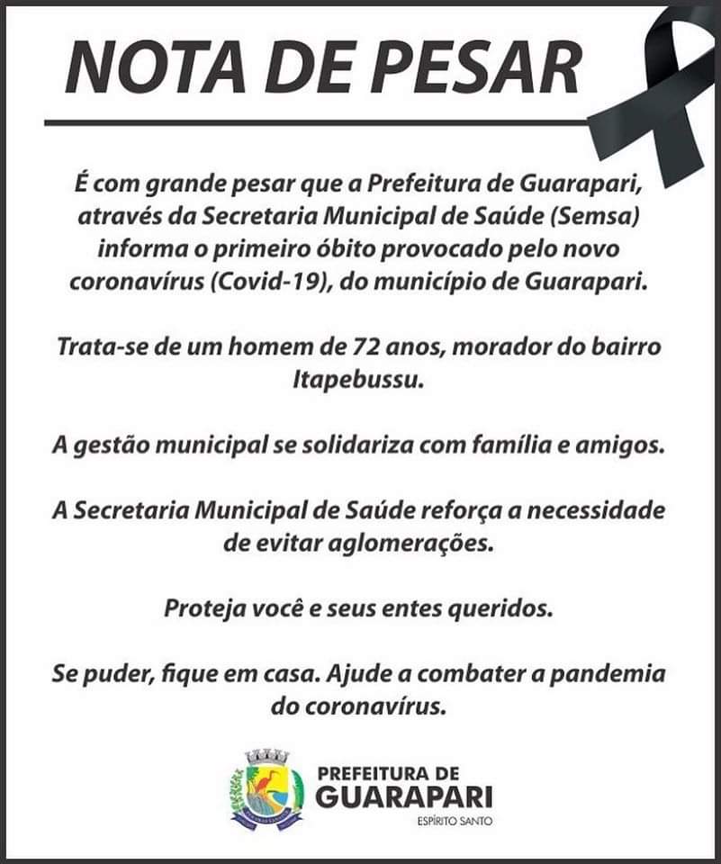Início Destaques Guarapari tem a primeira morte pelo covid-19 DestaquesSaúde Guarapari tem a primeira morte pelo covid-19 Por Redação Colina Notícias - 28/04/2020 370 0 Compartilhado FacebookTwitterWhatsAppLinkedinTelegram Guarapari tem a primeira morte pelo covid-19 ARTIGOS RELACIONADOSMais do autor Morre idosa que teve rosto desfigurado após crime em Guarapari Ofertas de Primavera Grande Rio Lixo na Praia do Morro em Guarapari mancha um final de tarde que poderia ser só beleza