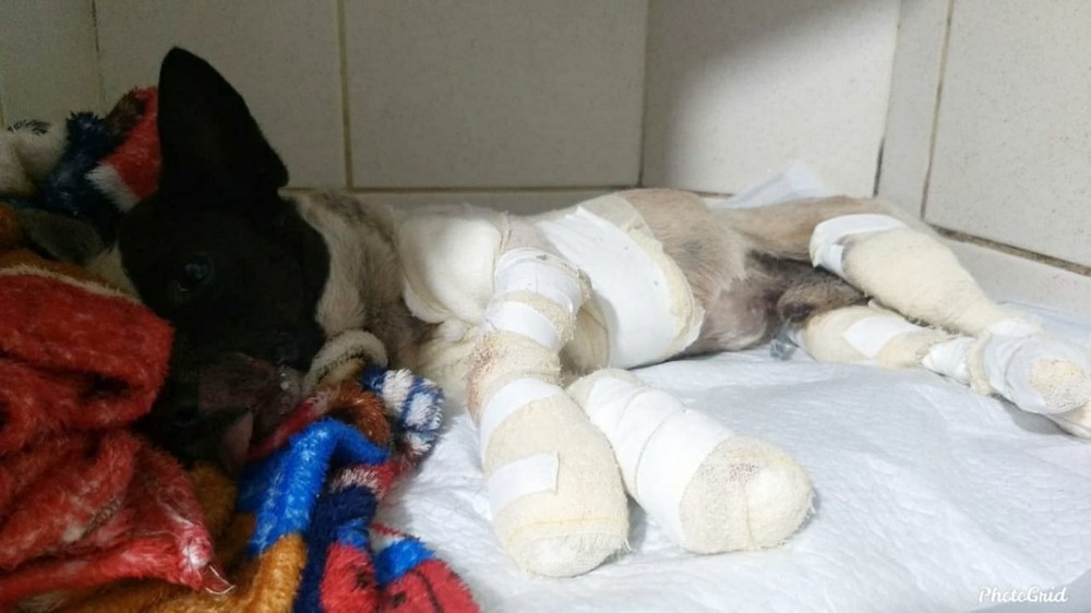 O cachorro teve ferimentos por todo o corpo, os ossos foram expostos, quebrou as quatro patas – duas estão praticamente mutiladas. Apesar da gravidade dos ferimentos, o cachorro está se recuperando
