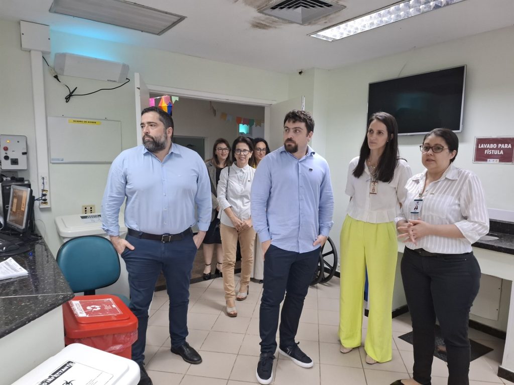 Durante a visita, a equipe conheceu as salas onde são realizadas as hemodiálises, entendeu como funciona o fluxo da rede de cuidado do HEVV e os projetos de humanização desenvolvidos nesse setor.