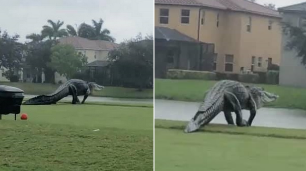 Nessa quarta-feira (11) um jacaré gigante foi flagrado andando com tranquilidade em um clube de campo no oeste da Flórida. O tamanho do réptil chamou atenção daqueles que estavam no local.
