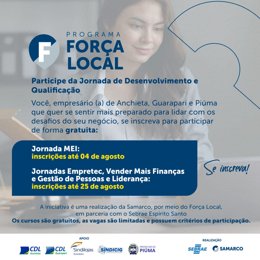 Estão abertas as inscrições para as jornadas de desenvolvimento e qualificação do Força Local, aos empresários de Anchieta, Guarapari e Piúma (ES). Os cursos e consultorias serão conduzidos pelo Sebrae Espírito Santo, e visam capacitar o empreendedor local para que ele se sinta mais preparado para lidar com os desafios do seu negócio.