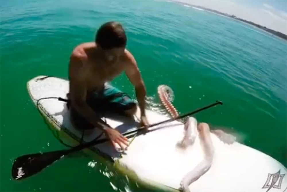 Um vídeo, publicado pela ONG @savingthewaves, flagrou o momento em que uma lula gigante tenta interagir com um remador de stand up paddle que pulou da prancha pouco tempo depois.