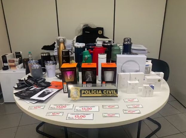 Cerca de 45 mil produtos falsificados, que seriam revendidos a lojistas como se fossem originais, foram apreendidos em Vitória. Entre os itens estão copos térmicos, eletrônicos como carregadores e fones de ouvido e brinquedos sem certificação do Instituto Nacional de Metrologia, Normalização e Qualidade Industrial (Inmetro).