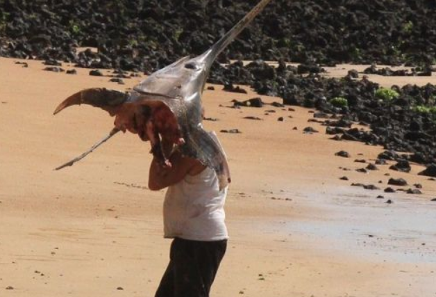Em determinado momento, um dos animais se aproxima da areia e acaba encalhando. O Marlin foi puxado por alguns moradores para fora da água e morto. A carne do peixe foi dividida entre as pessoas.