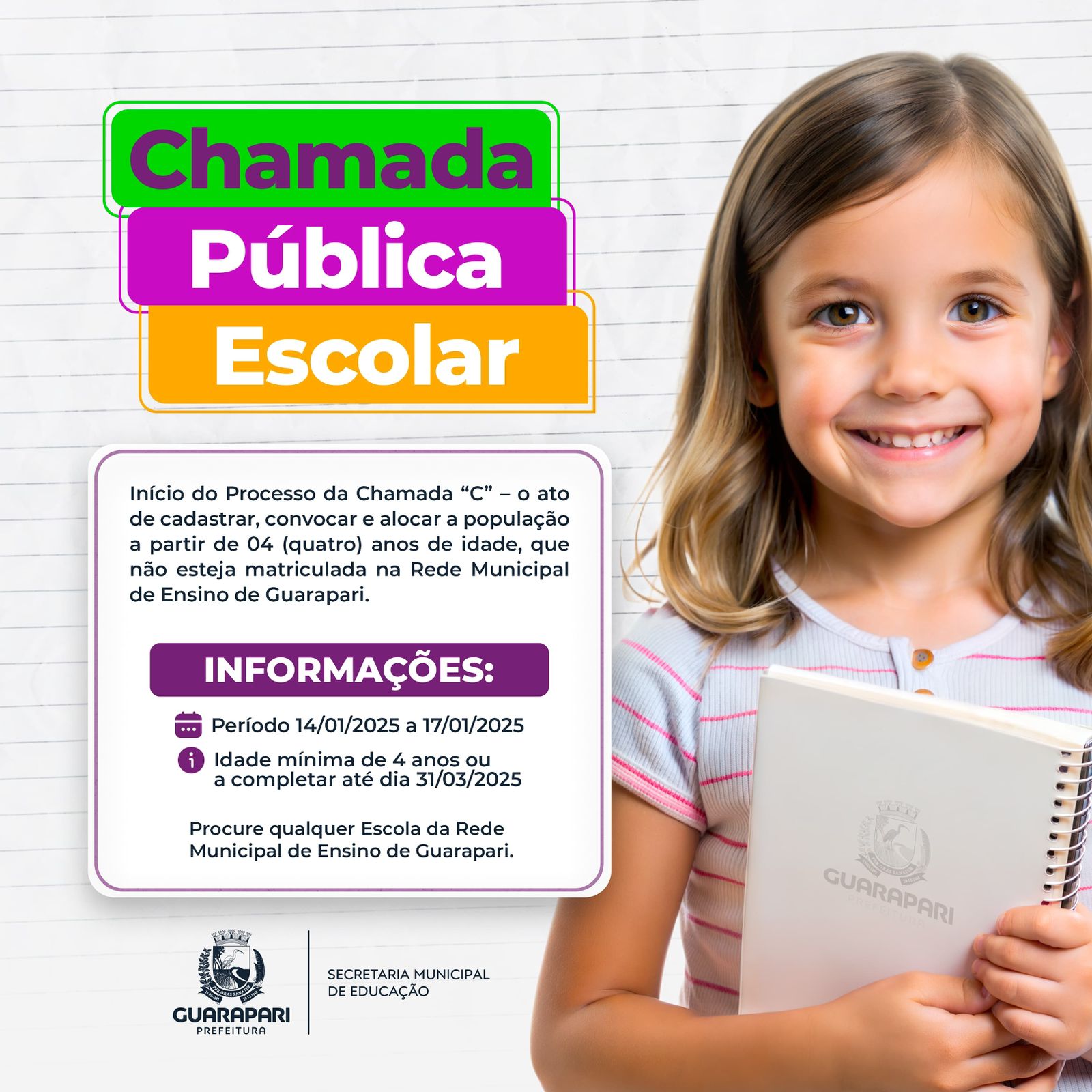 A partir desta terça-feira, 14 de janeiro de 2025, a Rede Municipal de Ensino de Guarapari dá início ao processo de matrícula para a Chamada Pública Escolar “C”, que visa cadastrar, convocar e alocar crianças a partir de 4 anos de idade que ainda não estão matriculadas nas escolas da cidade.