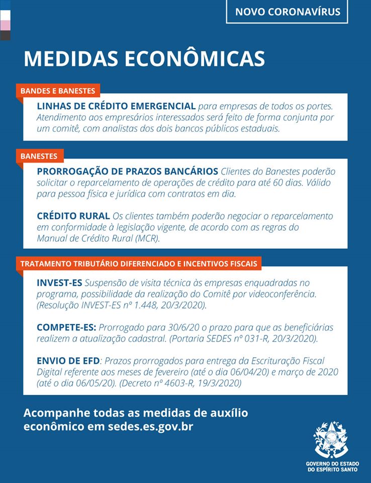 No site da Secretaria de Desenvolvimento (Sedes) está disponível um boletim que reúne as principais medidas adotadas pelo Estado e por instituições financeiras nacionais.
