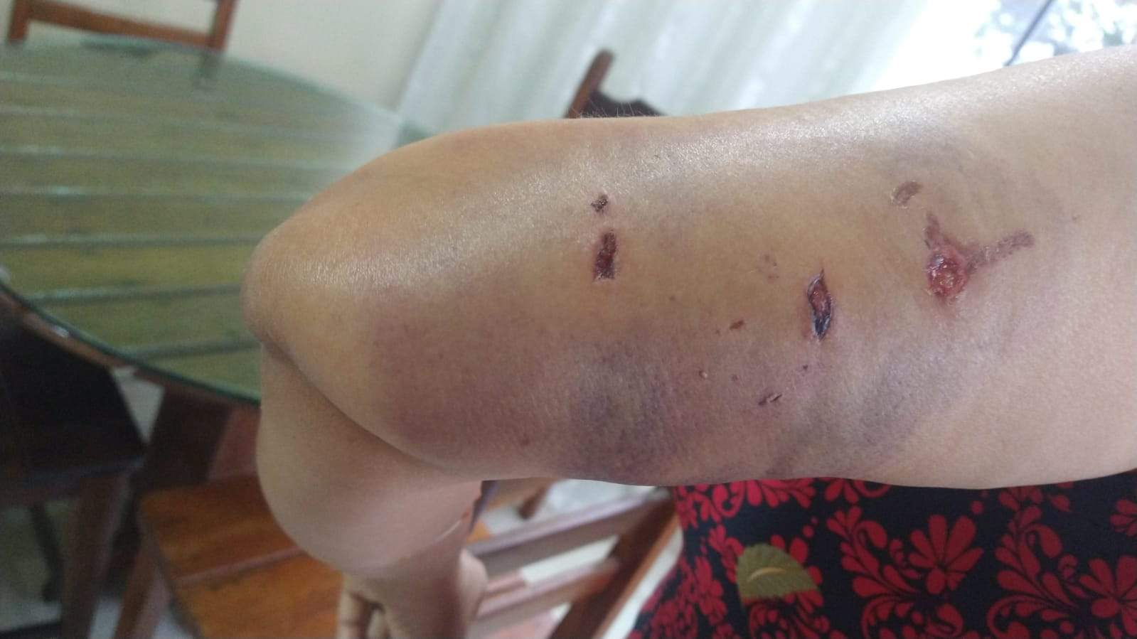“Eu fechei meu portão e dei de cara com o cachorro. Daí eu pensei que se abrisse o portão, ele iria me atacar. Se eu corresse, também me atacaria. Foi aí que ele me deu três mordidas”, contou.