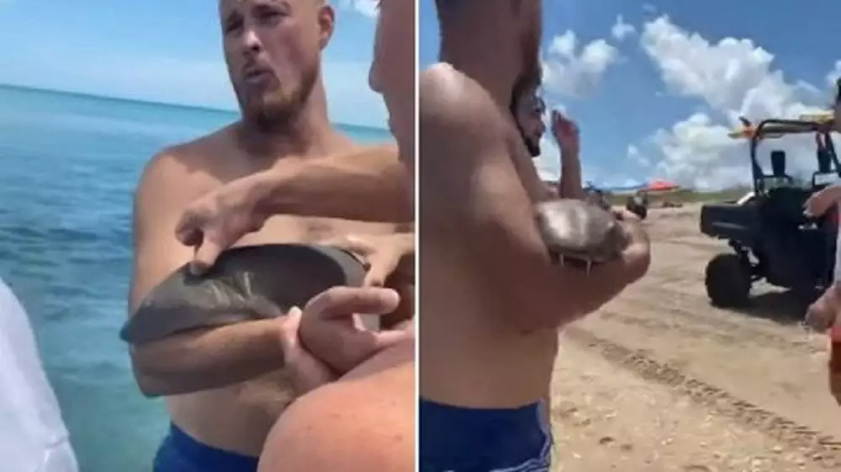 De acordo com apuração do “Sun”, o caso aconteceu em Jensen Beach, na Flórida (EUA). Um homem foi visto caminhando na areia com um tubarão preso em seu antebraço.
