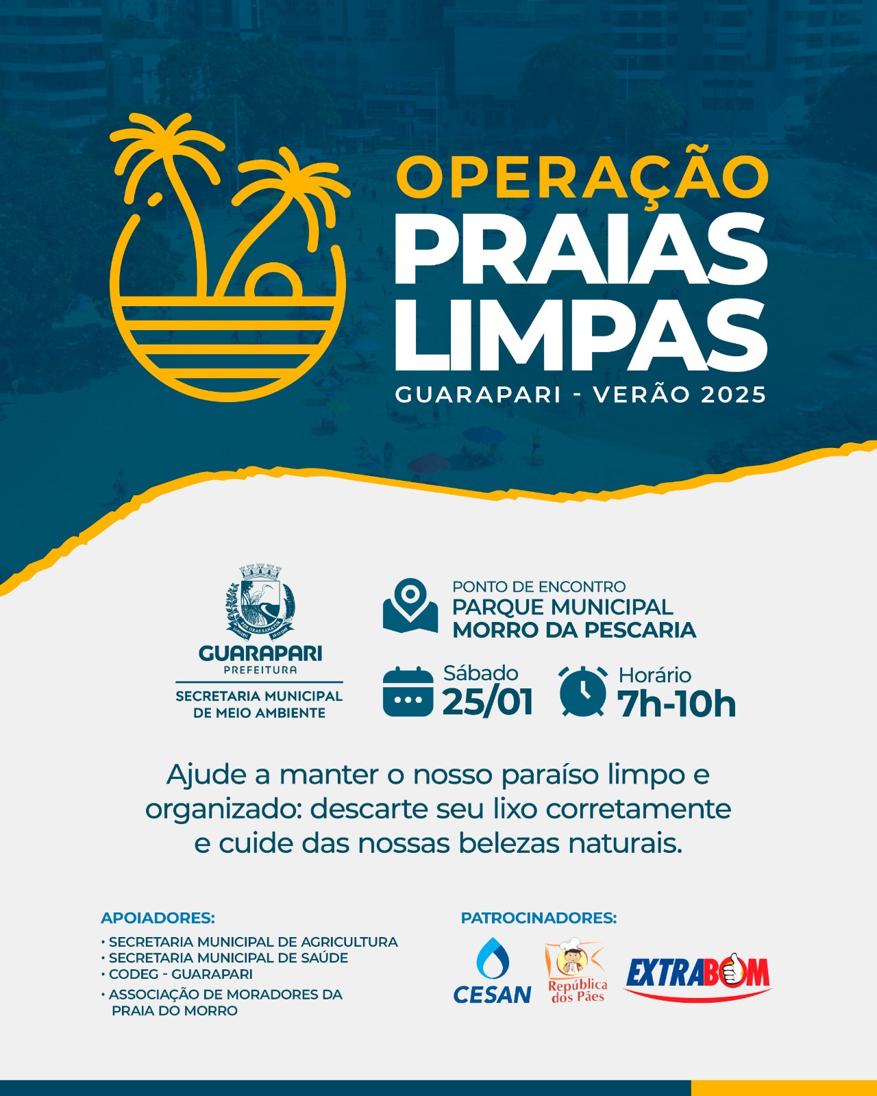Neste sábado, das 7h às 10h, a Secretaria Municipal de Meio Ambiente dará início à Operação Praias Limpas Verão 2025 com uma ação de limpeza no final da Praia do Morro, e Praia da Cerca. O encontro para o início da limpeza será na entrada do Parque Municipal Morro da Pescaria.