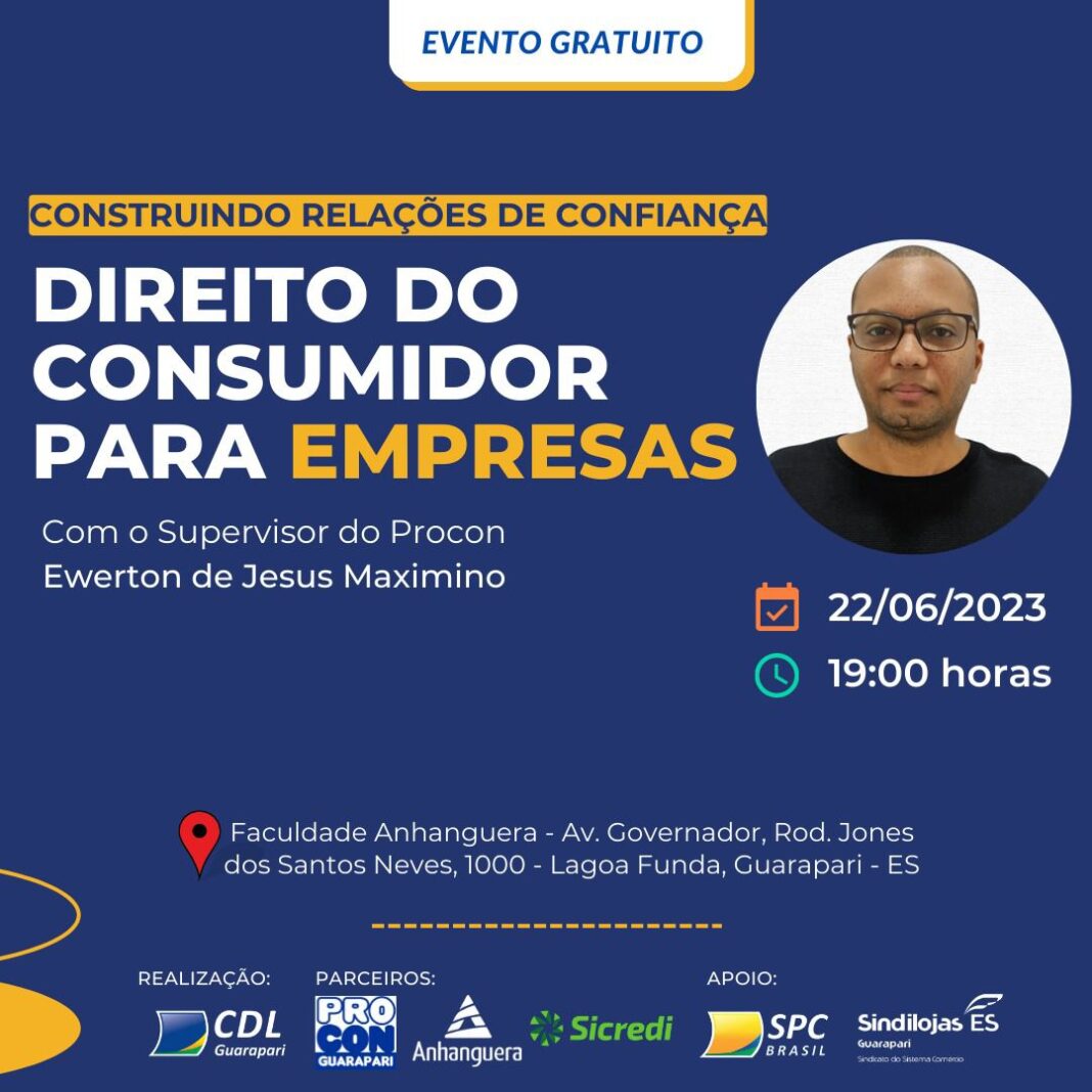 Não perca a oportunidade única de participar da palestra exclusiva sobre “Direito do Consumidor para Empresas”, ministrada pelo especialista Ewerton de Jesus Maximino, supervisor do Procon!