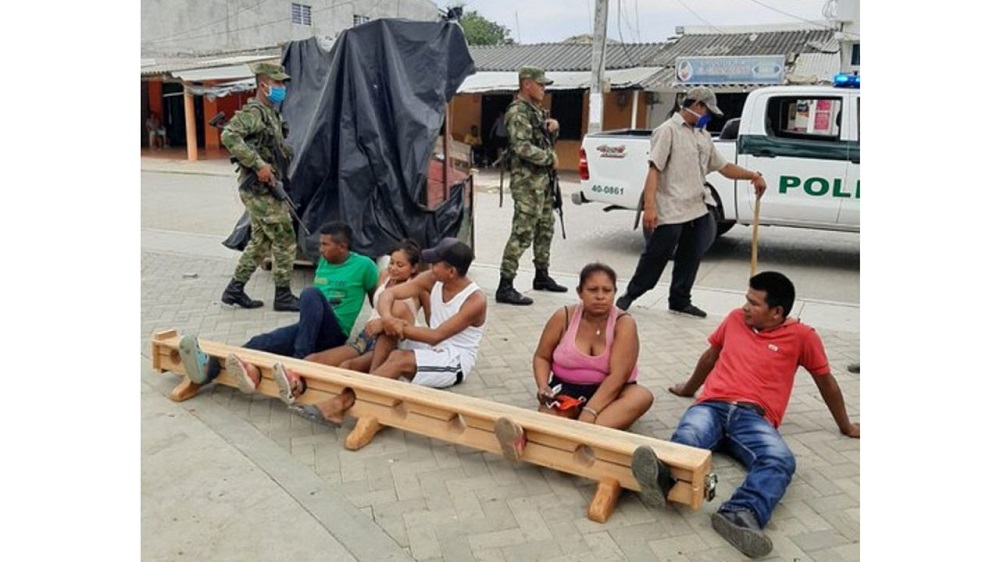 A prefeitura do município de Tuchín, na Colômbia, prendeu, pelos pés, alguns moradores que desobedeceram ordem de quarentena. A medida serve para evitar a proliferação do novo coronavírus. Os habitantes são amarrados em uma estrutura de madeira conhecida como cepo, em meio a uma das praças públicas da cidade.