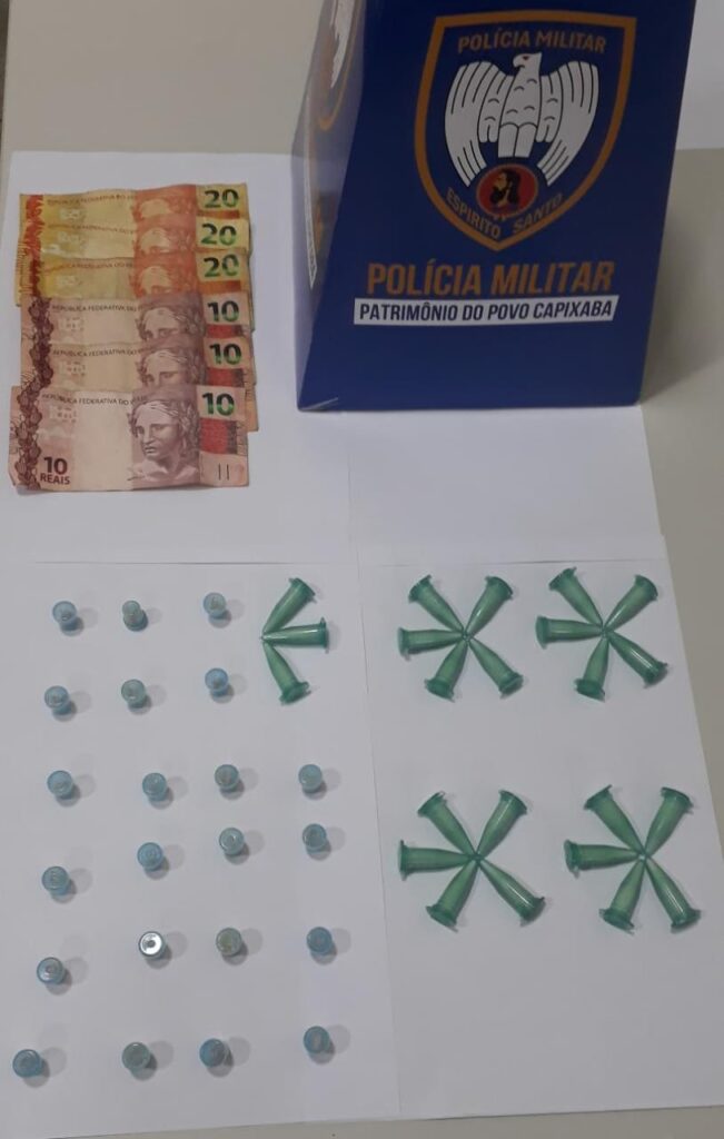 em posse do suspeito 22 pedras de crack, R$90,00 em dinheiro e 23 pinos de cocaína.