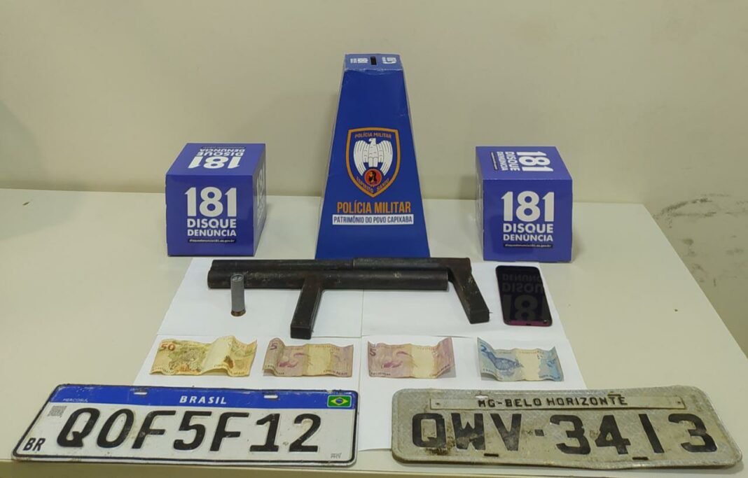 12, 01 munição do mesmo calibre, 01 Celular, R$62,00 em espécie e 02 Placas de veículo. A