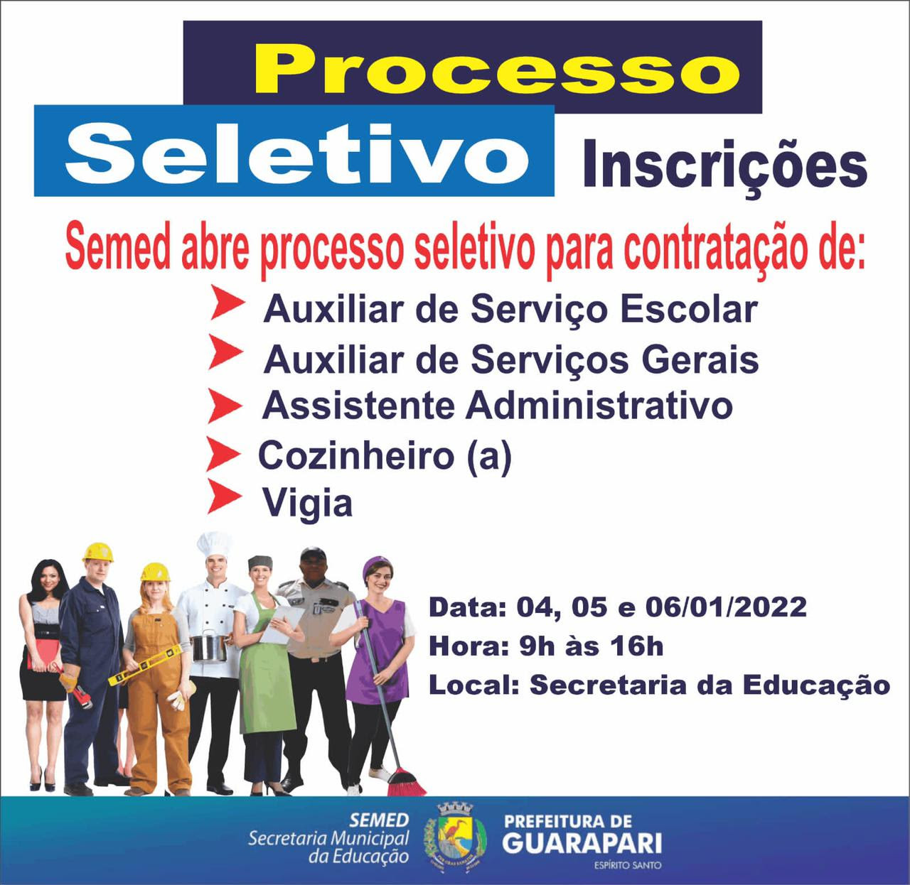 A Prefeitura de Guarapari, através da Secretaria Municipal de Educação (Semed), divulgou o Edital 001/202, para realizar Processo Seletivo Simplificado de contratações temporárias, com o objetivo de preencher os cargos de auxiliar de serviço escolar, auxiliar de serviços gerais, cozinheiro, vigia, assistente administrativo contábil e assistente administrativo, para atuação nas escolas da Rede Municipal e na sede da Semed, no ano letivo de 2022.