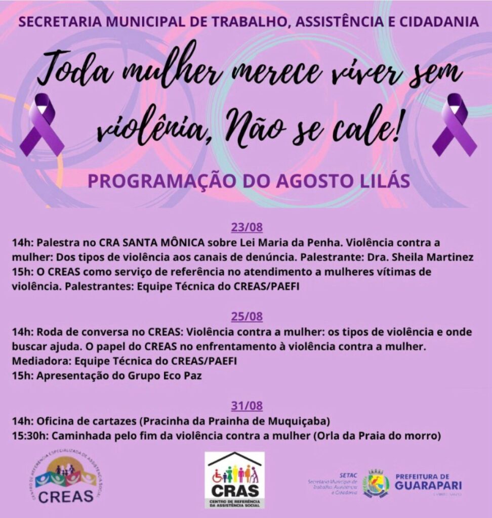 Na próxima quinta-feira (31), a Prefeitura de Guarapari, através da Secretaria de Assistência, Trabalho e Cidadania (Setac), promoverá uma caminhada em prol do fim da violência contra as mulheres. A iniciativa faz parte da campanha “Toda Mulher Merece Viver Sem Violência, Não se Cale!”, que integra as atividades do Agosto Lilás, promovido pela Setac.