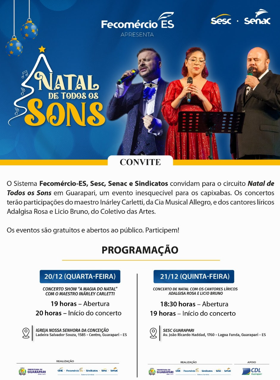 Os eventos contarão com a participação de renomados artistas, proporcionando momentos de pura emoção e arte para toda a família. O maestro Inarley Carletti, junto à Cia Musical Allegro, abrilhantará o primeiro espetáculo, o “Concerto Show: A Magia do Natal”, a ser realizado no dia 20 de dezembro, quarta-feira, na Igreja Nossa Senhora da Conceição. A abertura está marcada para às 19 horas, com início do concerto às 20 horas. Já no dia 21 de dezembro, quinta-feira, será a vez dos talentosos cantores líricos Adalgisa Rosa e Licio Bruno, do Coletivo das Artes, encantarem o público com o “Concerto de Natal”. O evento terá sua abertura às 18h30, com início do concerto às 19 horas, no Sesc Guarapari.