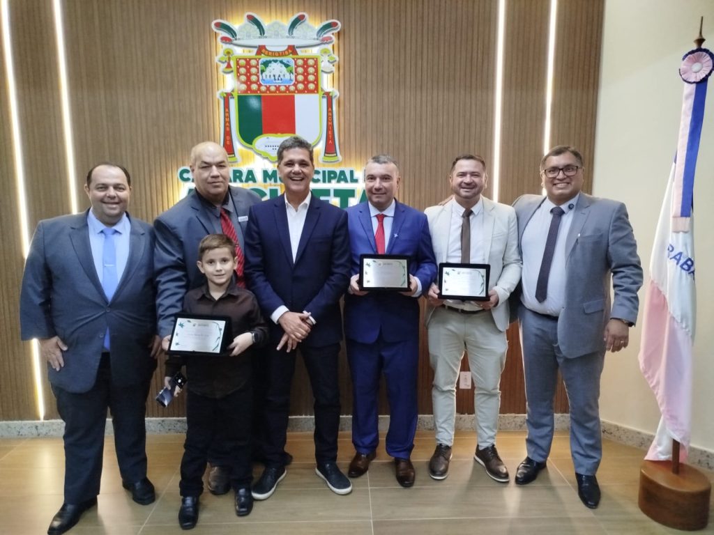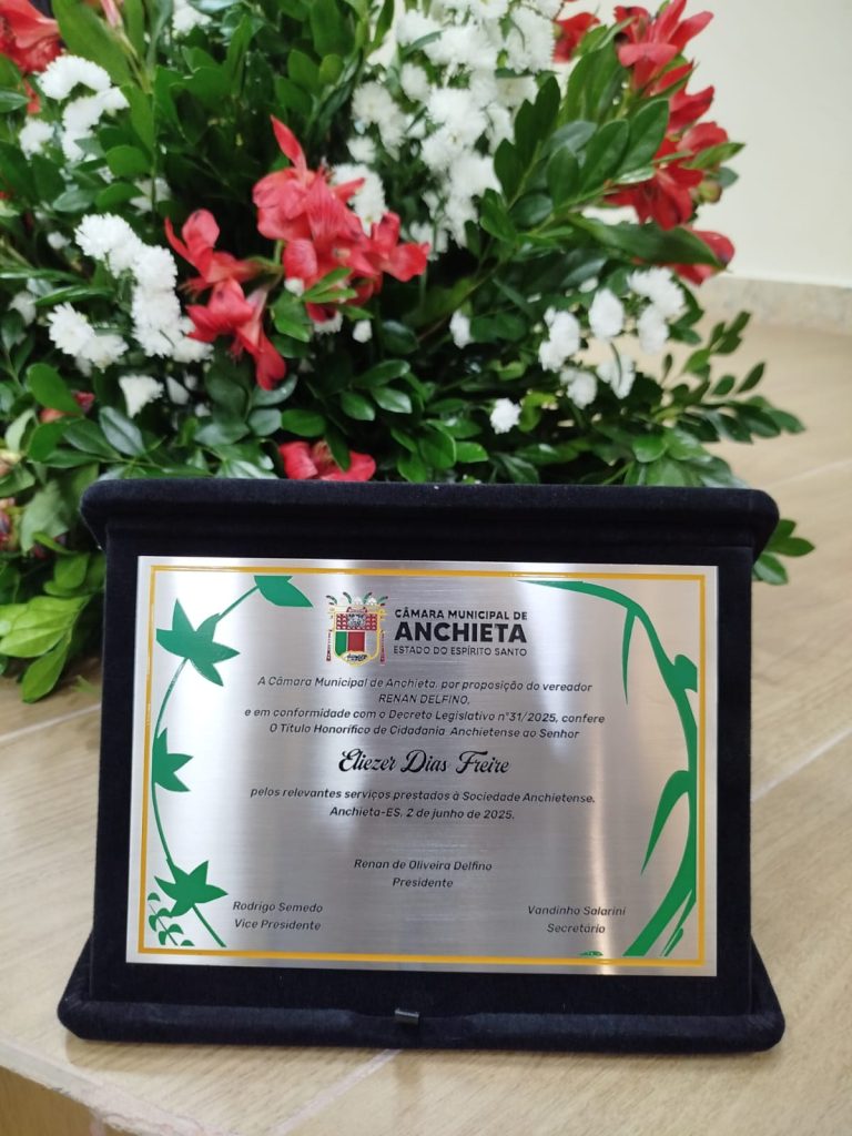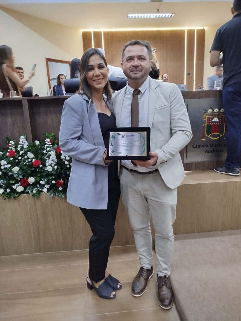 Já o prefeito de Anchieta, Leonardo “Léo Português” Abrantes, foi homenageado com a Comenda de Honra ao Mérito na Gestão Pública, concedida pelo vereador Silvinho, em reconhecimento à sua liderança administrativa e aos investimentos realizados no município nos últimos anos. O vice-prefeito Renato Lorencini também esteve presente na cerimônia.