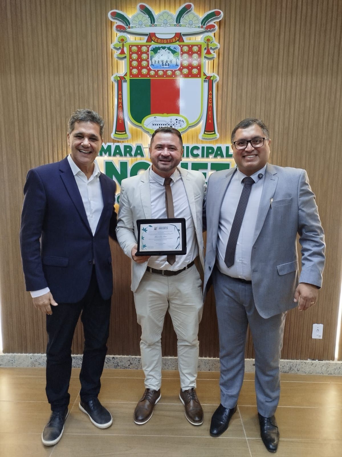 Já o prefeito de Anchieta, Leonardo “Léo Português” Abrantes, foi homenageado com a Comenda de Honra ao Mérito na Gestão Pública, concedida pelo vereador Silvinho, em reconhecimento à sua liderança administrativa e aos investimentos realizados no município nos últimos anos. O vice-prefeito Renato Lorencini também esteve presente na cerimônia.